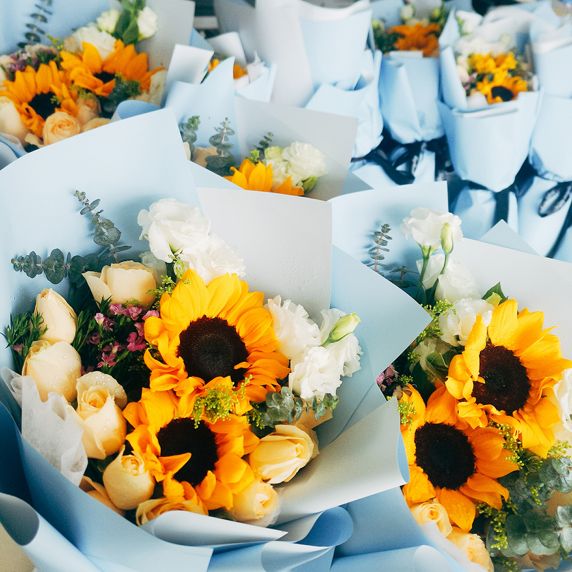 上午十一點,項目組為女同事們預定的鮮花花束和巧克力準時抵達,淡藍色的包裝紙簇擁著太陽花、香檳玫瑰、白桔梗、相思梅和尤佳麗葉,金燦燦的一簇中點綴著潔白,與公司各位佳人的笑靨十分相襯。